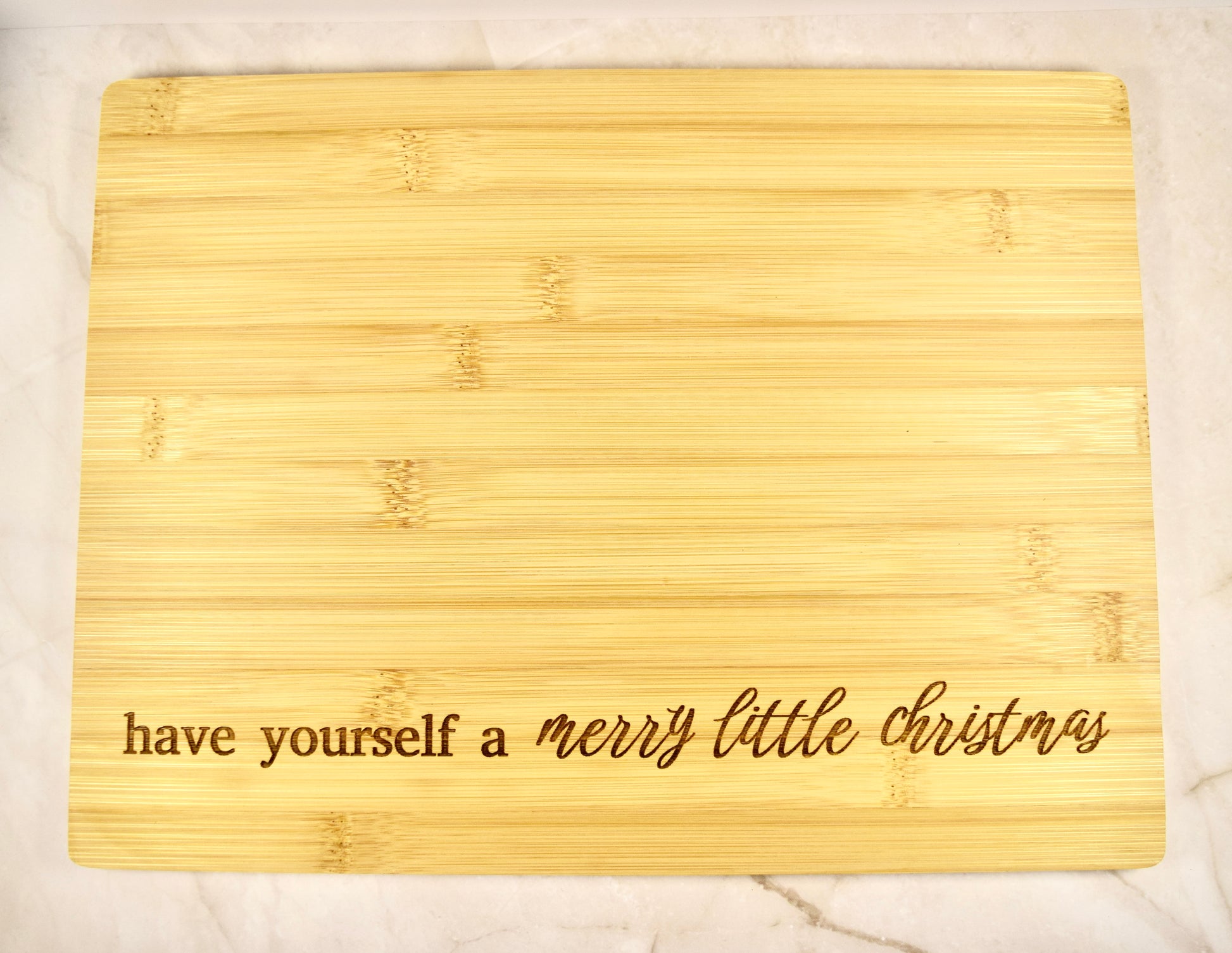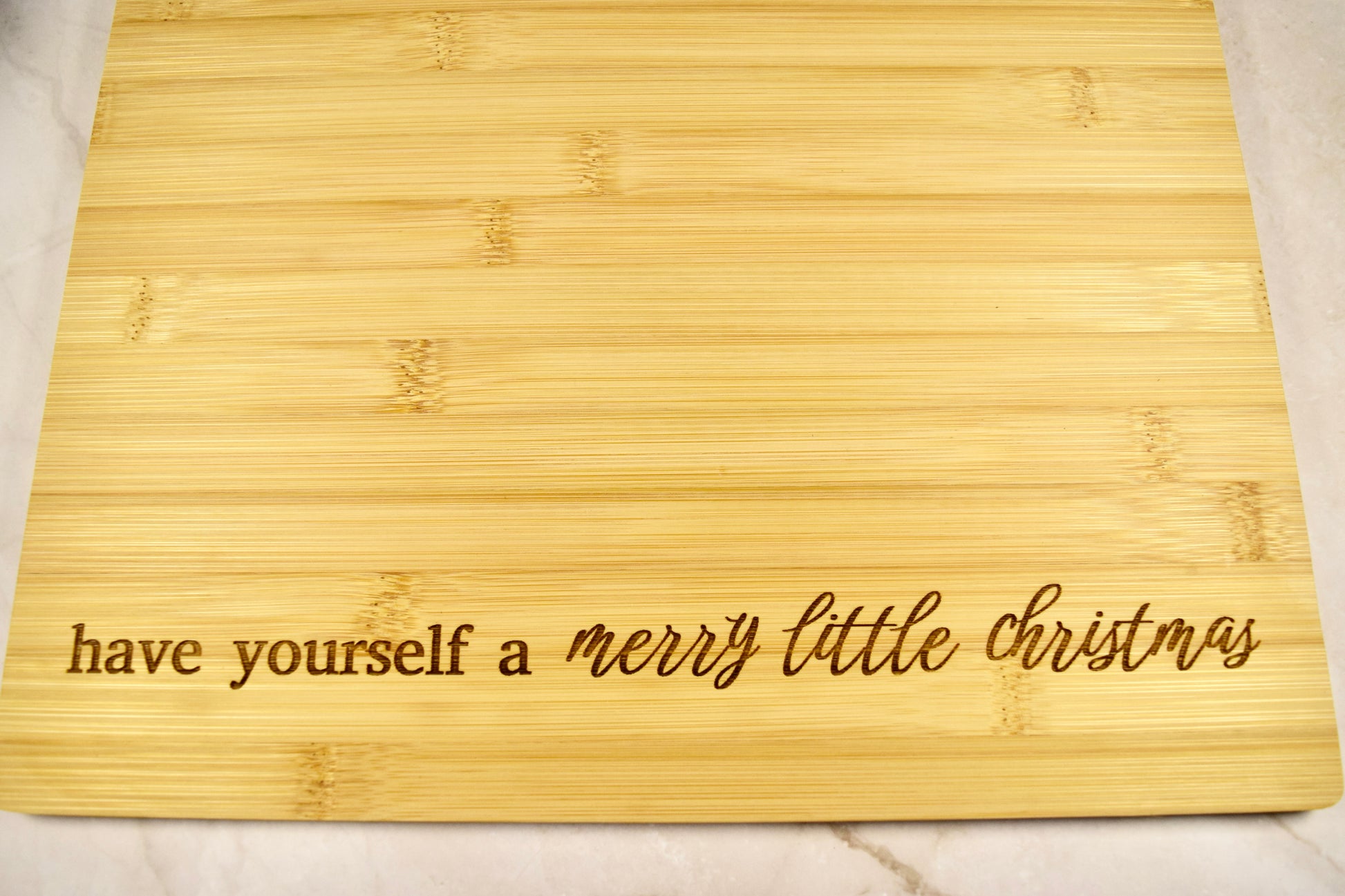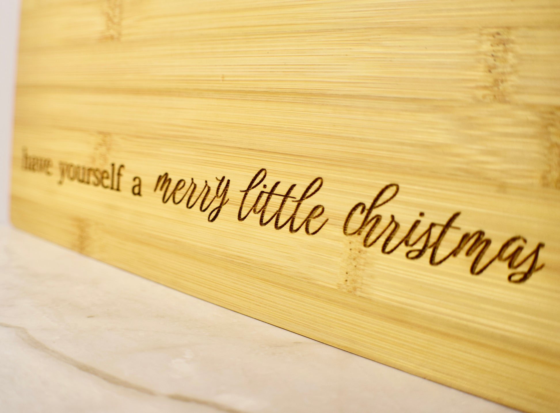 Add a little holiday cheer to your kitchen—or give a gift that’s as beautiful as it is practical—with this engraved bamboo cutting board. Featuring the timeless lyric “Have Yourself a Merry Little Christmas,” it’s a cozy seasonal accent for serving treats or prepping your favorite festive recipes. Each board is crafted from 100% natural bamboo and laser engraved in our workshop for a crisp, lasting design that won’t fade or peel.