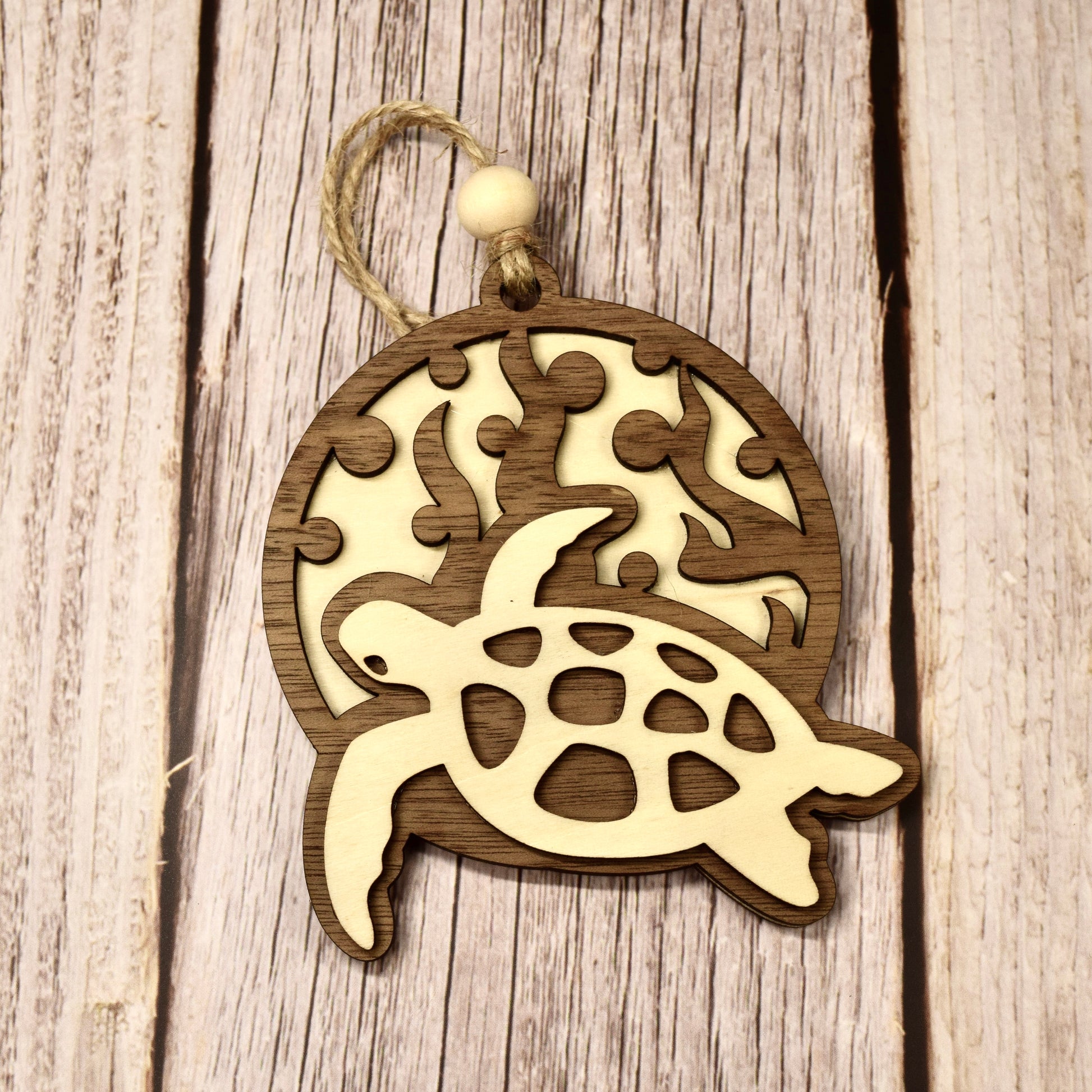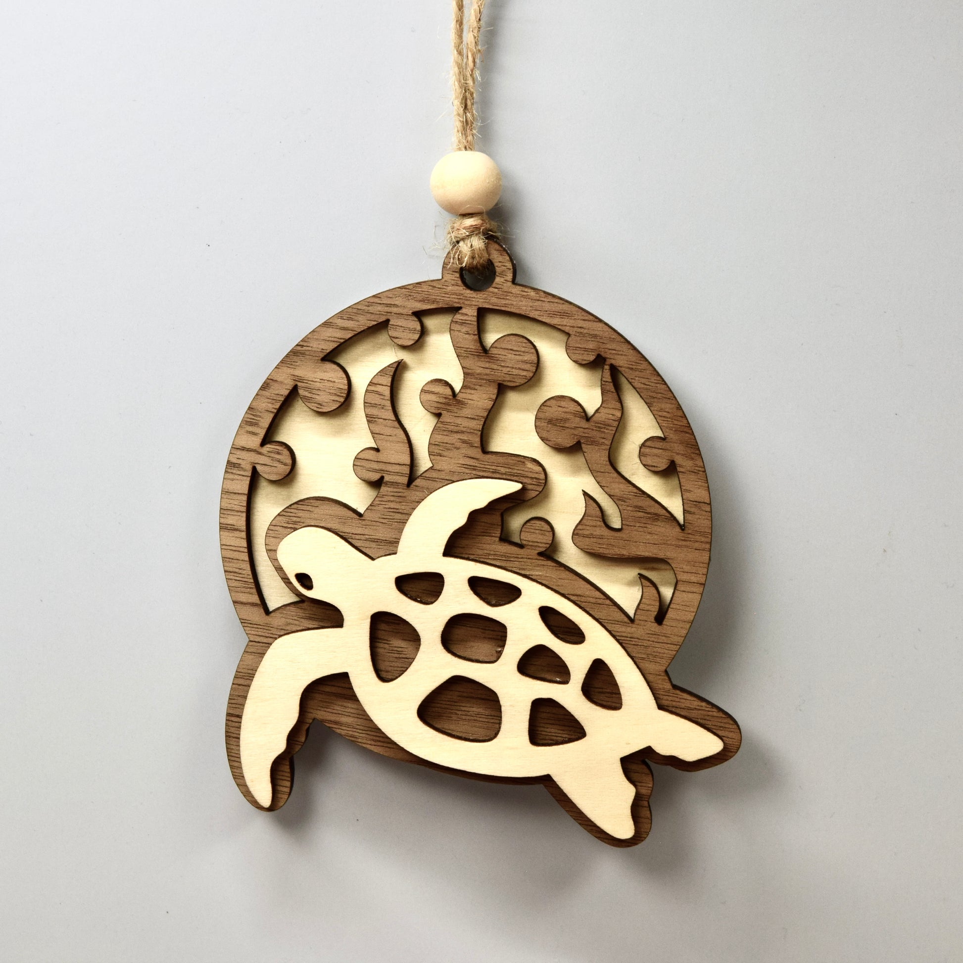 Handmade 3-Layer Wood Ornament – Rustic Basswood & Walnut - Sea Turtle