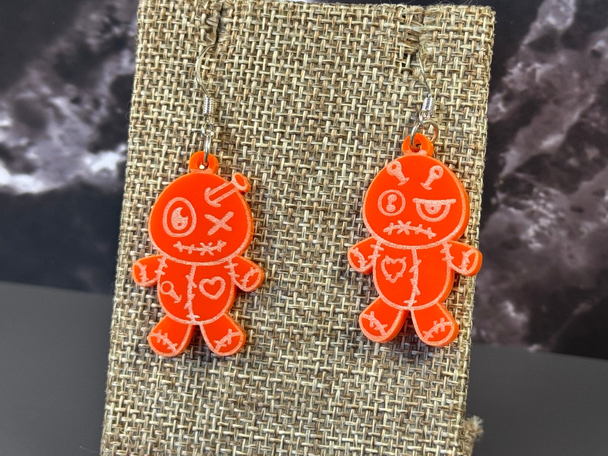 So ugly they’re cute—meet your new favorite spooky season accessory. These playful voodoo doll earrings are laser cut from high-gloss acrylic in your choice of orange, black, or pink. Each pair features a stitched-up doll design engraved into the surface, giving them just the right mix of creepy and charming.