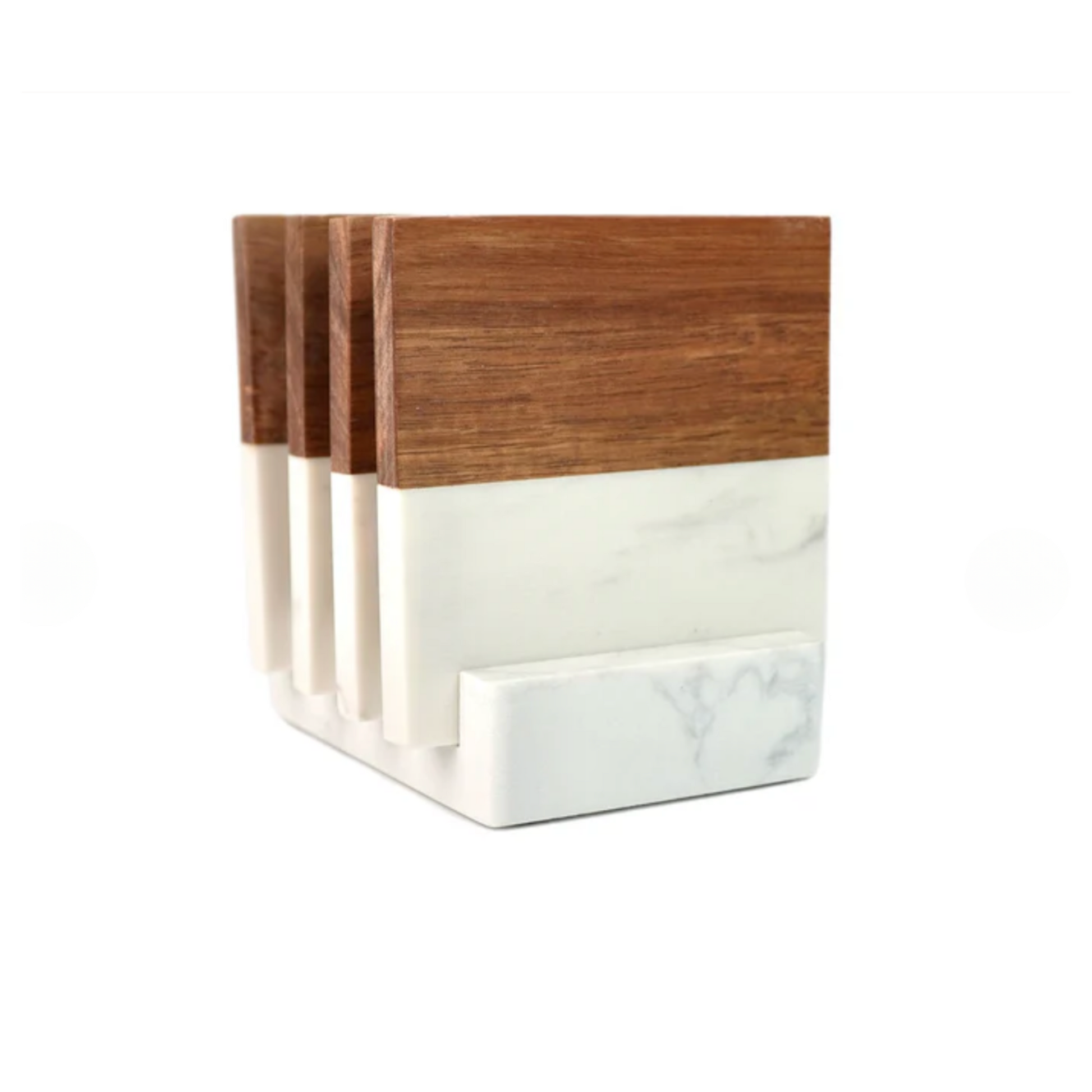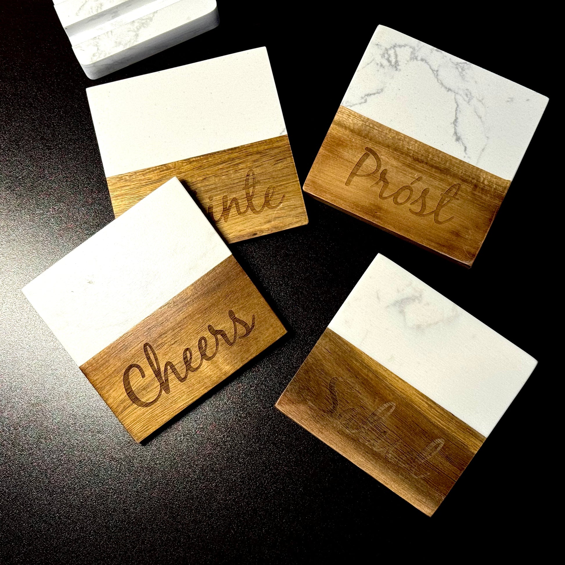 Raise a glass with style! This set of marble and wood coasters brings a touch of elegance to any occasion. Each set includes four coasters with a heavy marble display base for convenient storage. The bottom of each coaster has foam feet to protect your furniture. Each coaster in this set is engraved with the word “Cheers” in multiple languages, celebrating the joy of sharing drinks and good times across cultures.