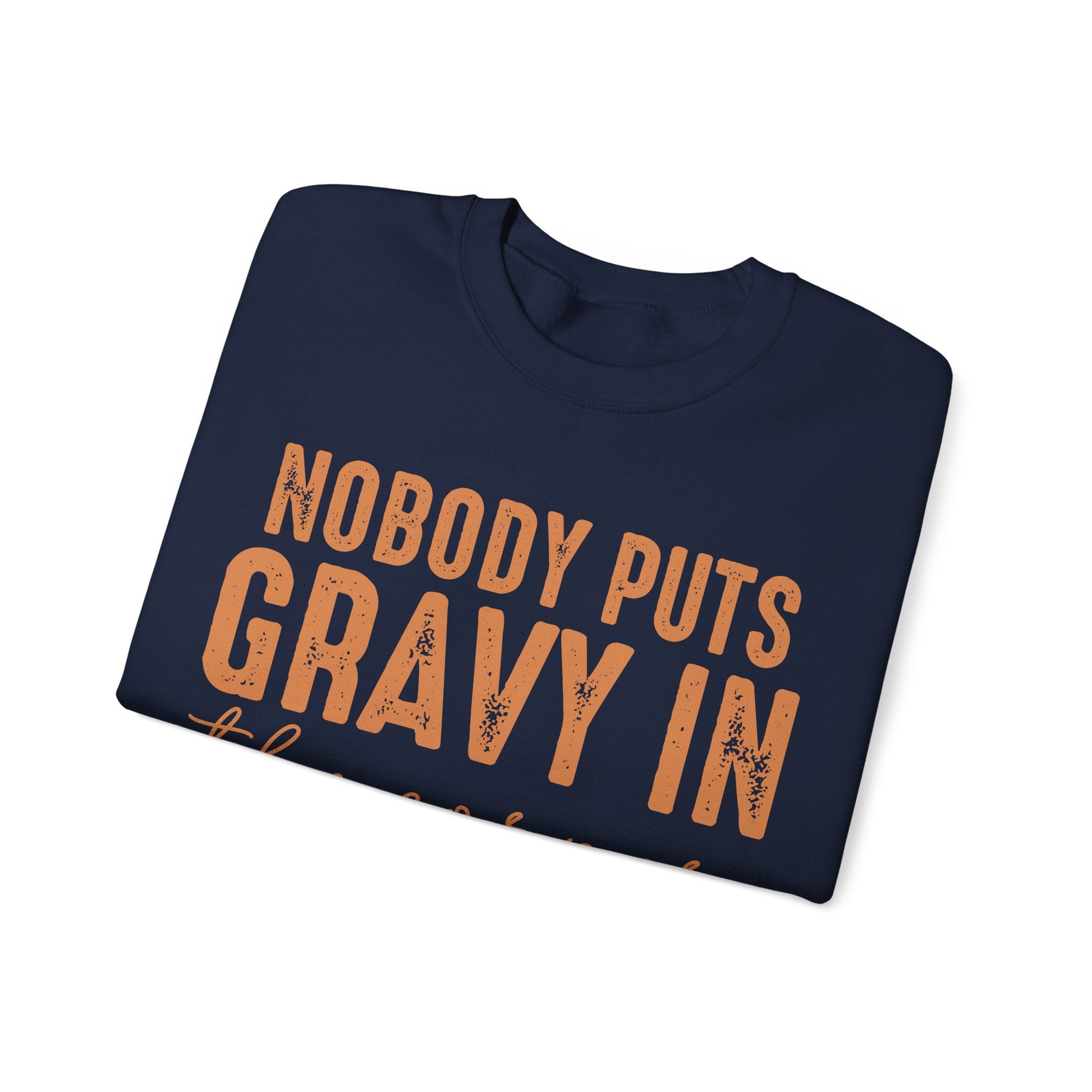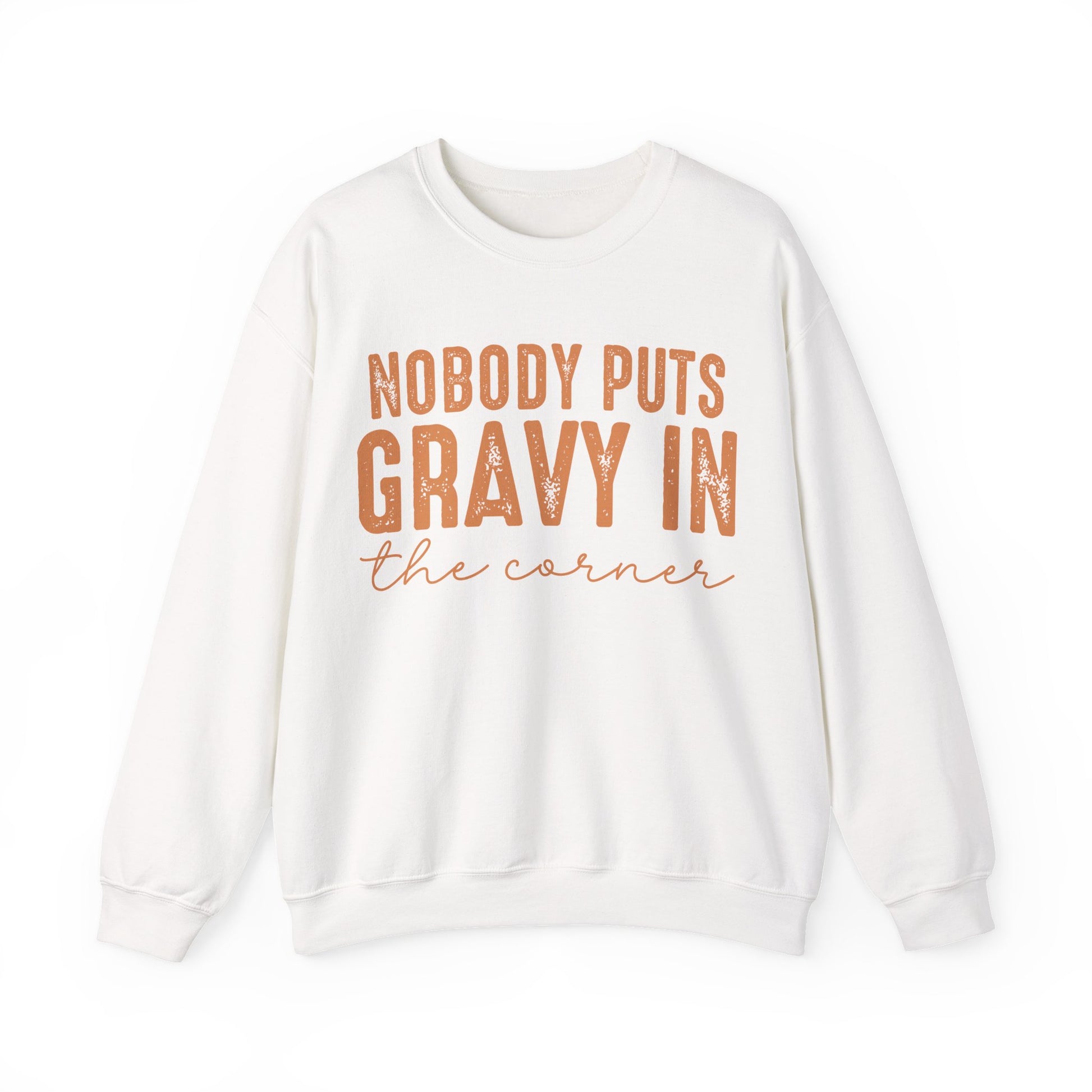 Celebrate the joy of the season with this Gildan crewneck sweatshirt, featuring the playful "Nobody Puts Gravy In The Corner" design. Soft, cozy, and crafted with comfort in mind, this sweatshirt brings a touch of humor to your Thanksgiving gatherings, fall weekends, or casual holiday moments.