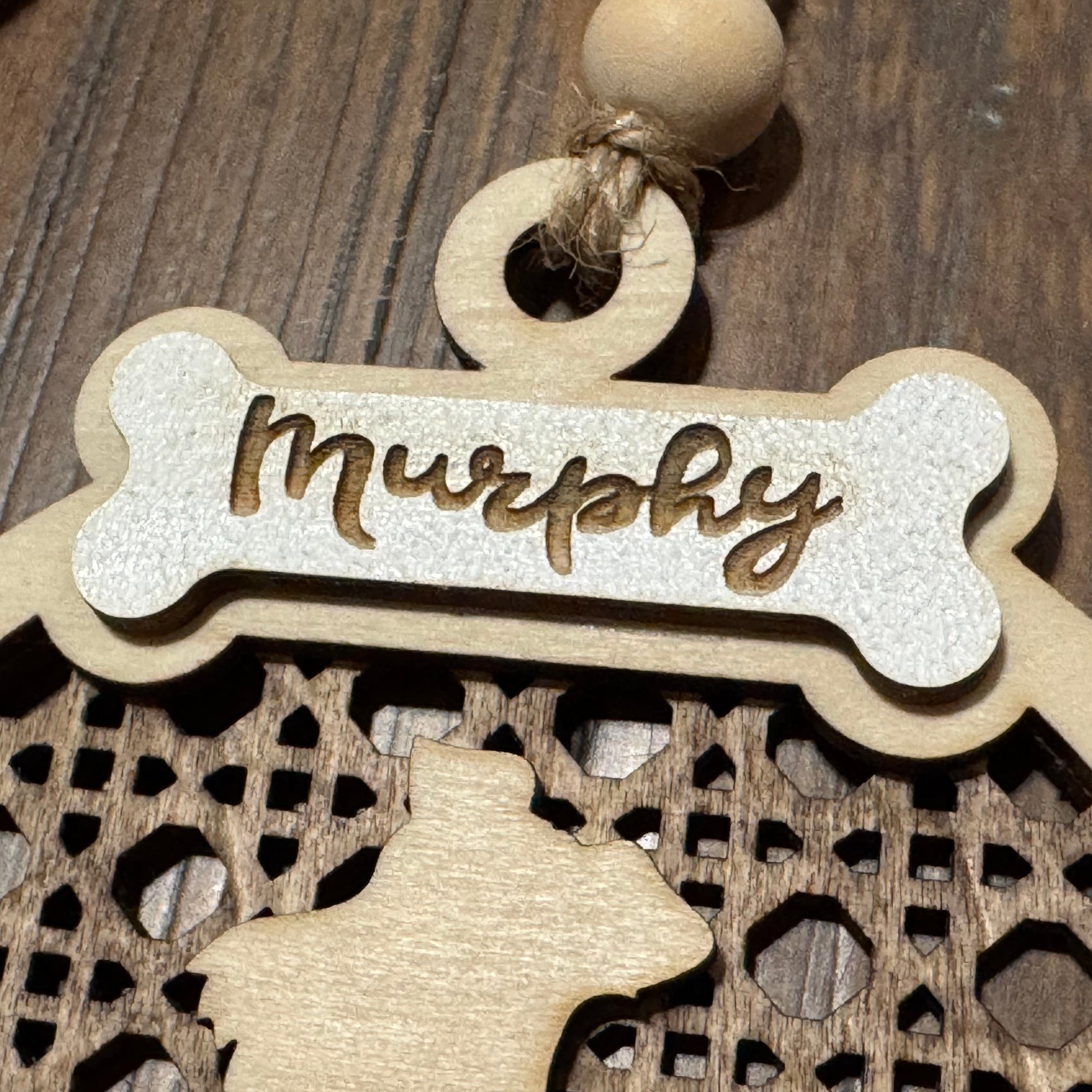 Celebrate your furry friend with this personalized layered wood pet ornament. The base features a laser-cut rattan-style design in walnut, topped with your chosen dog breed silhouette in a light natural wood. A hand-painted, laser-engraved white bone adds the perfect finishing touch, personalized with your pet’s name. Finished with a wood bead and jute rope, this ornament is a sweet and stylish way to honor your four-legged family member on the tree.