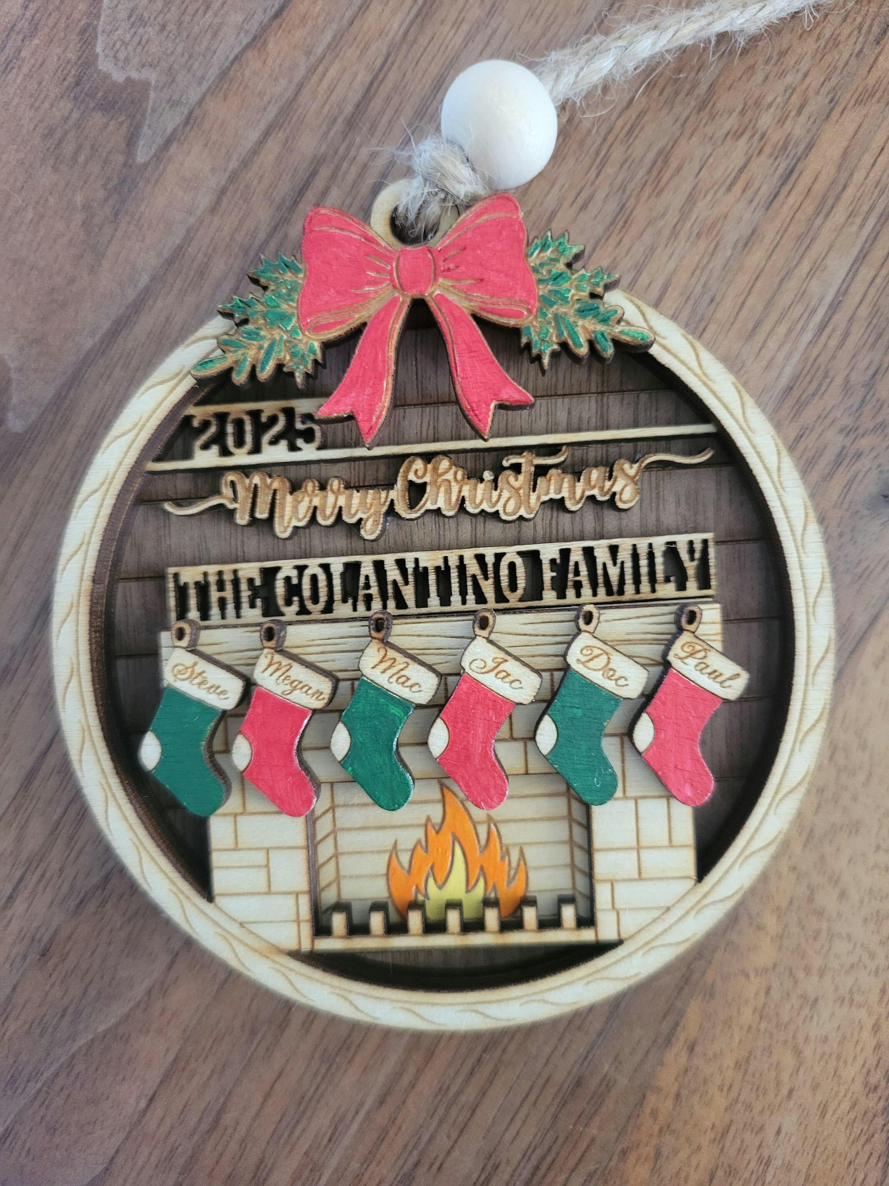 Each ornament is finished with a handpainted bow and greenery above the mantle and custom engraved stockings—one for each family member—hung with care. Sealed for lasting durability, this ornament brings warmth, craftsmanship, and tradition to your tree year after year.