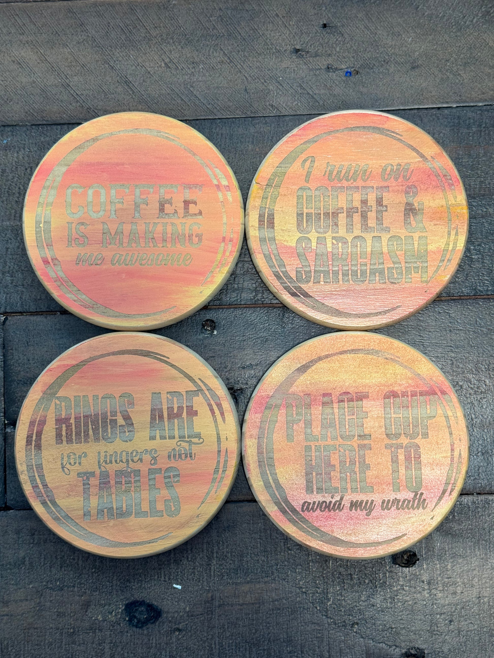 Add a splash of personality and color to your home with these hand painted and engraved wood coaster sets. Each coaster is painted by hand, ensuring every piece is unique, and then engraved with fun, playful sayings that are sure to spark conversation. With various styles available, you're sure to find the perfect match for your home, whether you're looking for something lighthearted, inspirational, or just plain fun.