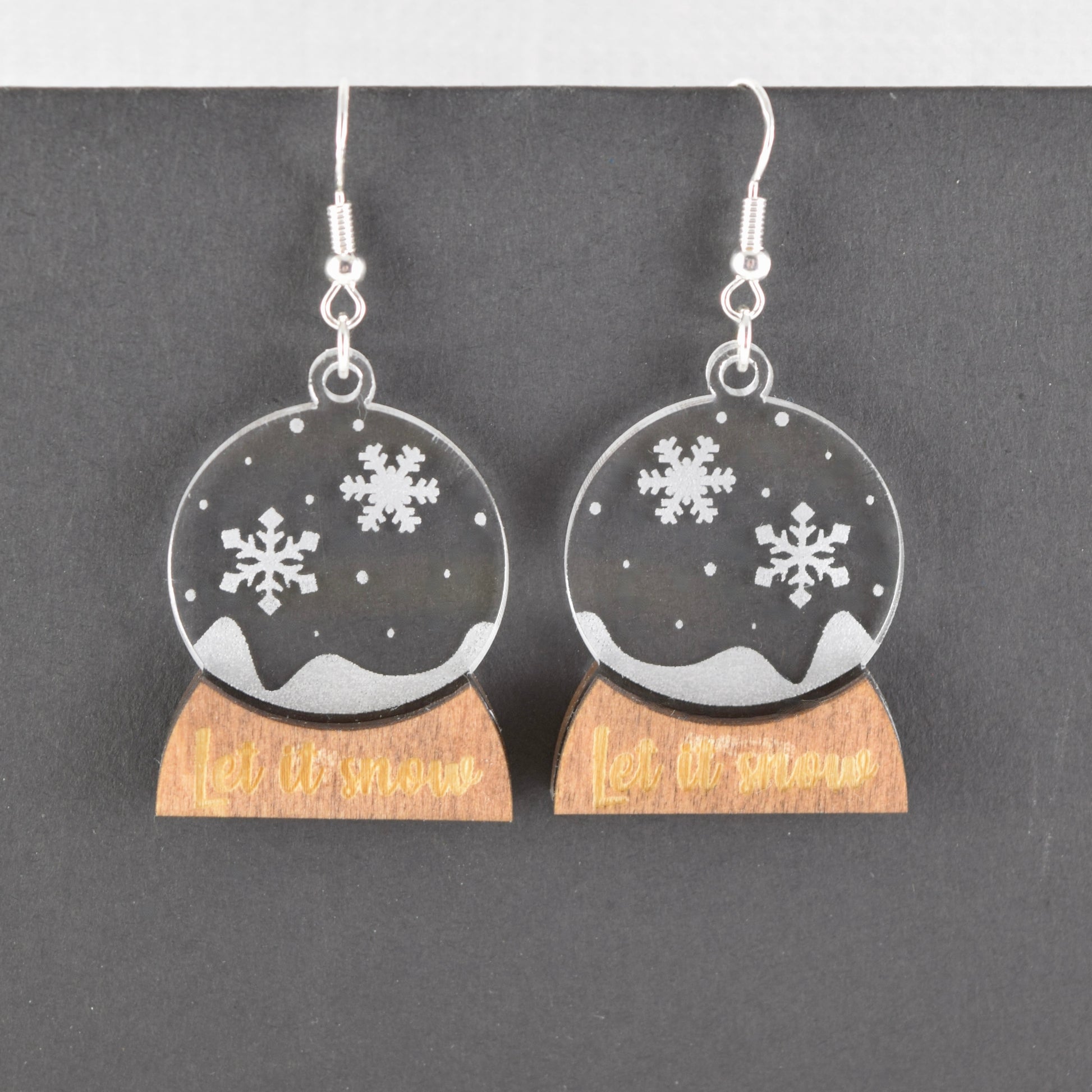Bring a little winter wonderland to your look with these handcrafted snow globe earrings! Made from a blend of clear acrylic and wood, each earring features a delicately engraved snow globe scene, capturing the charm of a real snow globe in miniature. The wooden base, engraved with "Let it snow," adds warmth and rustic detail, while the clear acrylic top gives a frosty, elegant effect. At about 1 inch on a fishhook drop, these earrings are the perfect blend of classy and fun – ideal for any festive outfit or special gift.