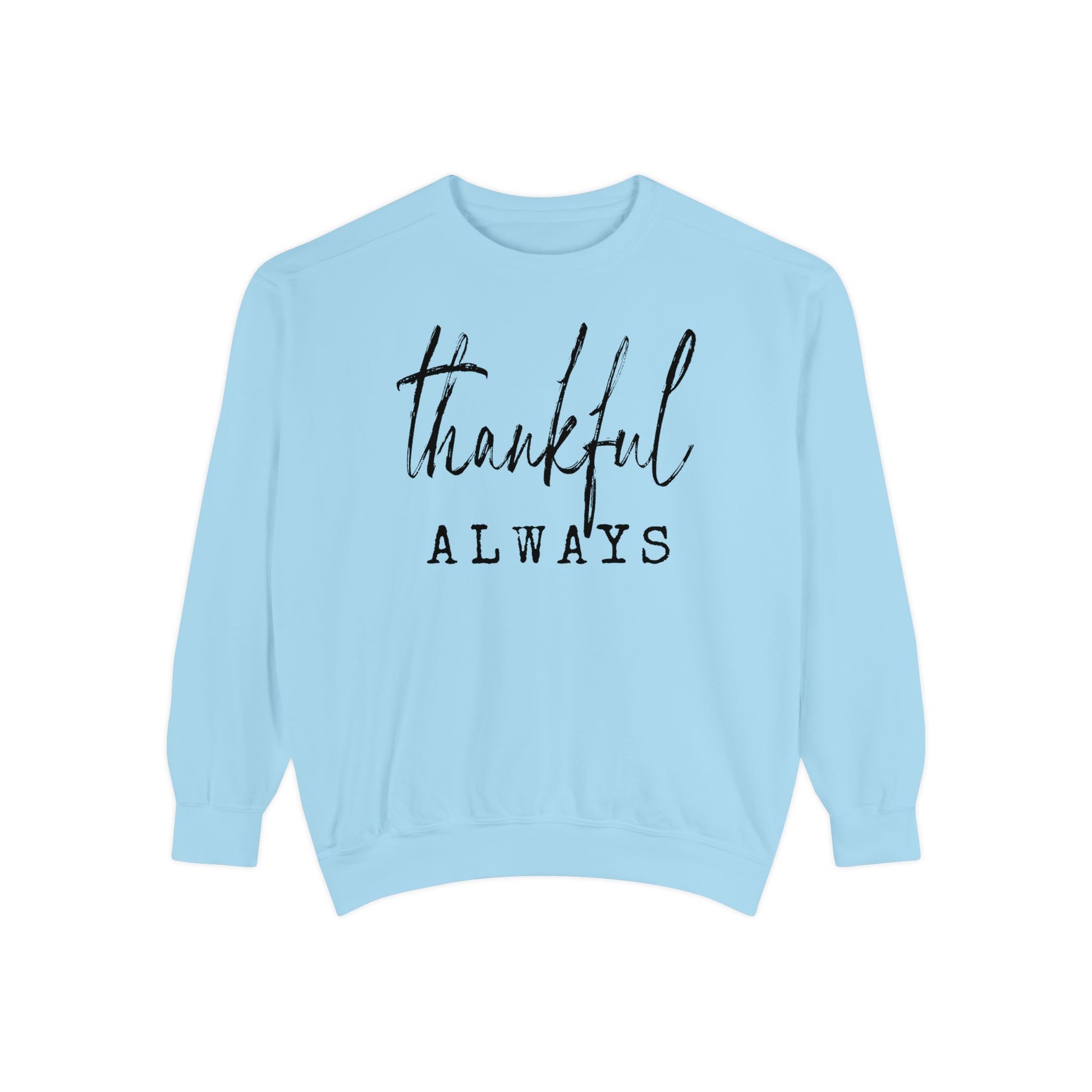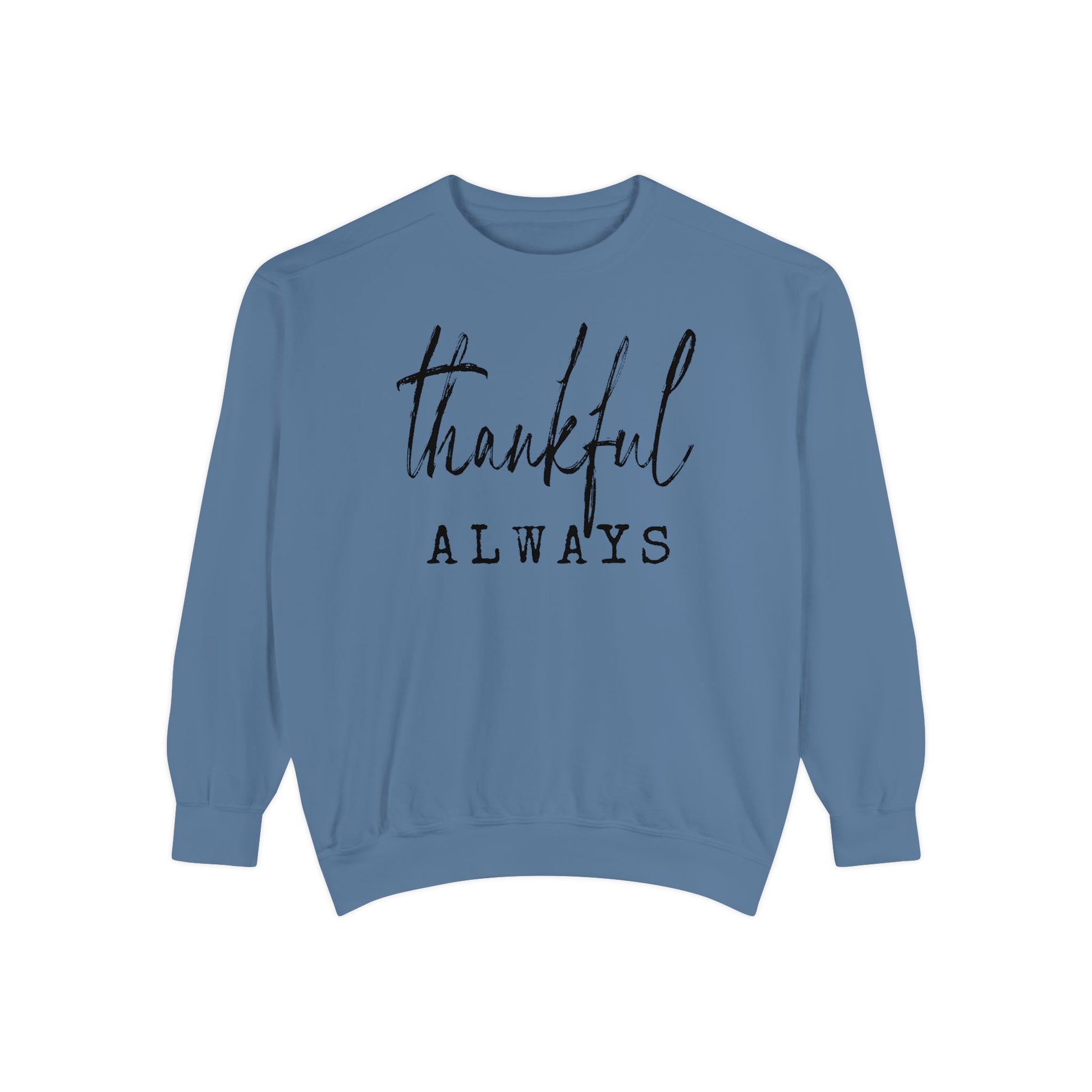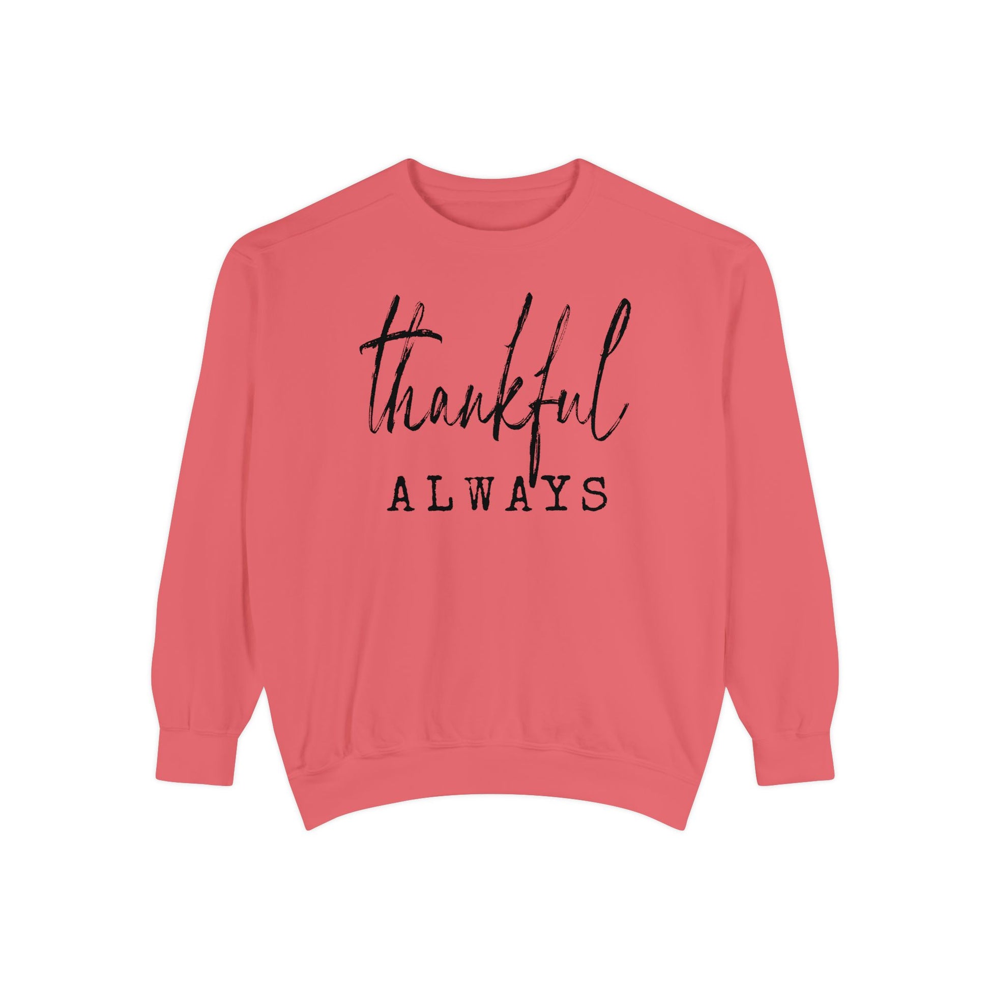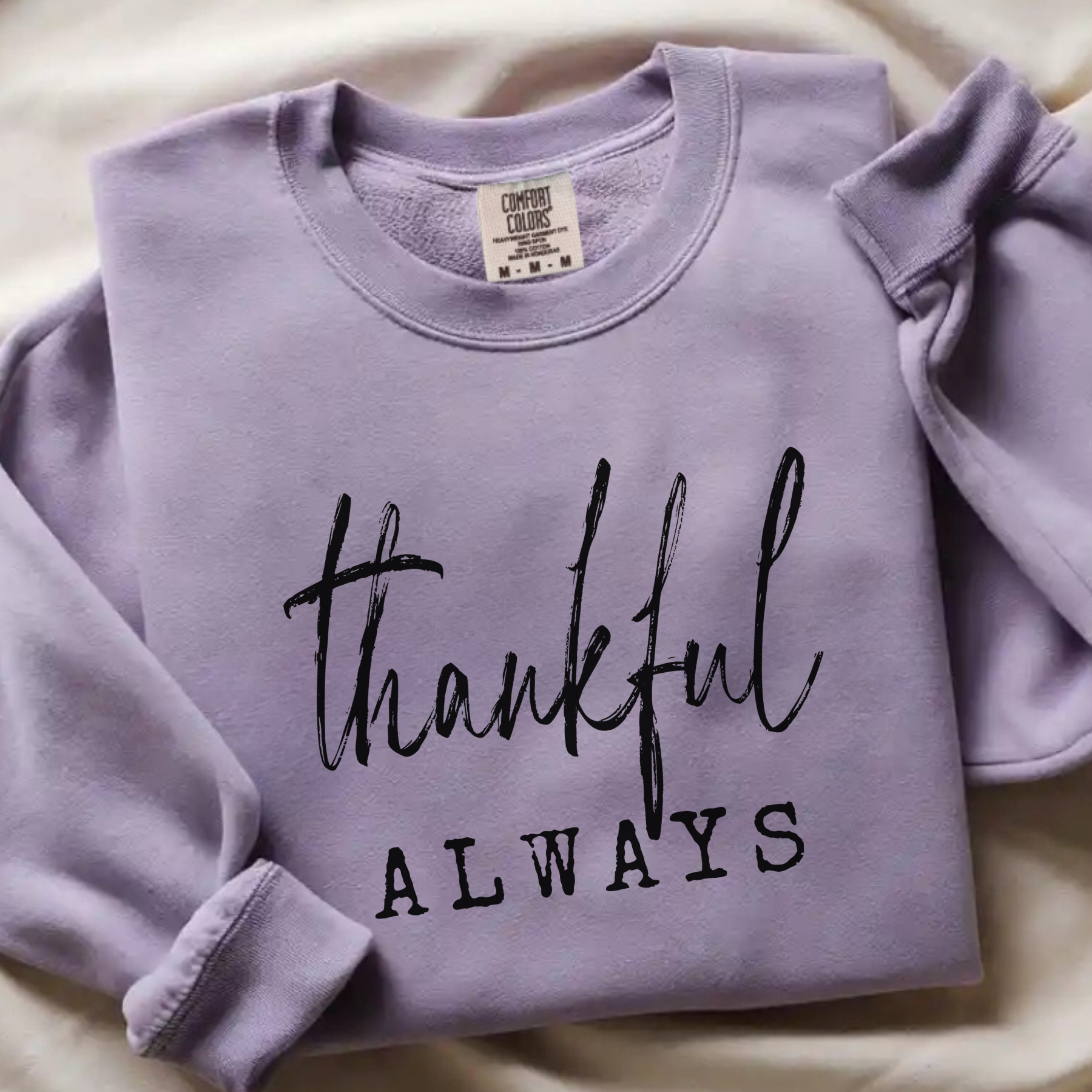 Stay cozy and grateful in this soft and stylish Comfort Colors 1566 crewneck sweatshirt featuring the phrase “thankful always”. With its relaxed fit, vintage-washed look, and lived-in comfort, this sweatshirt is perfect for autumn days, Thanksgiving gatherings, or anytime you want to share a little gratitude.