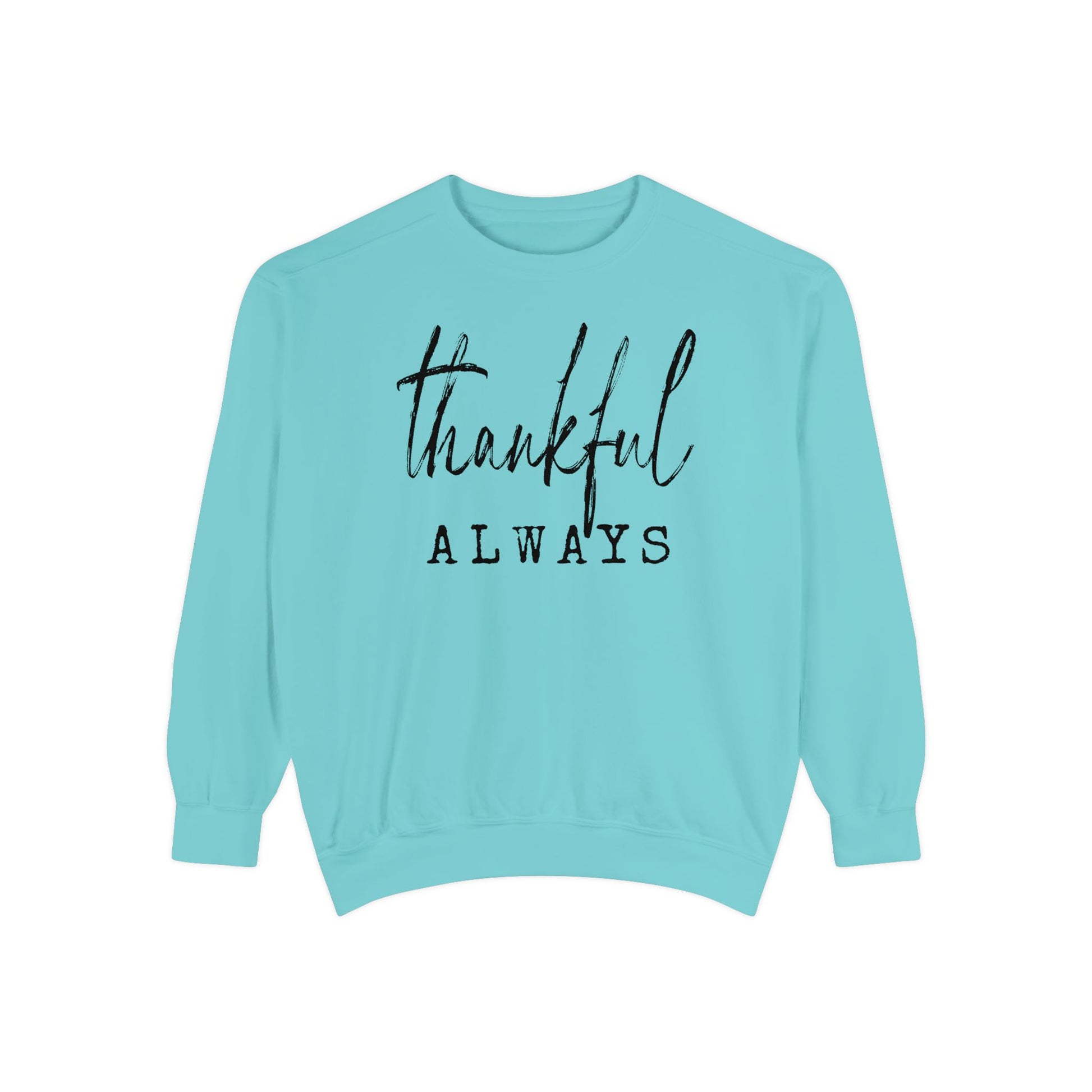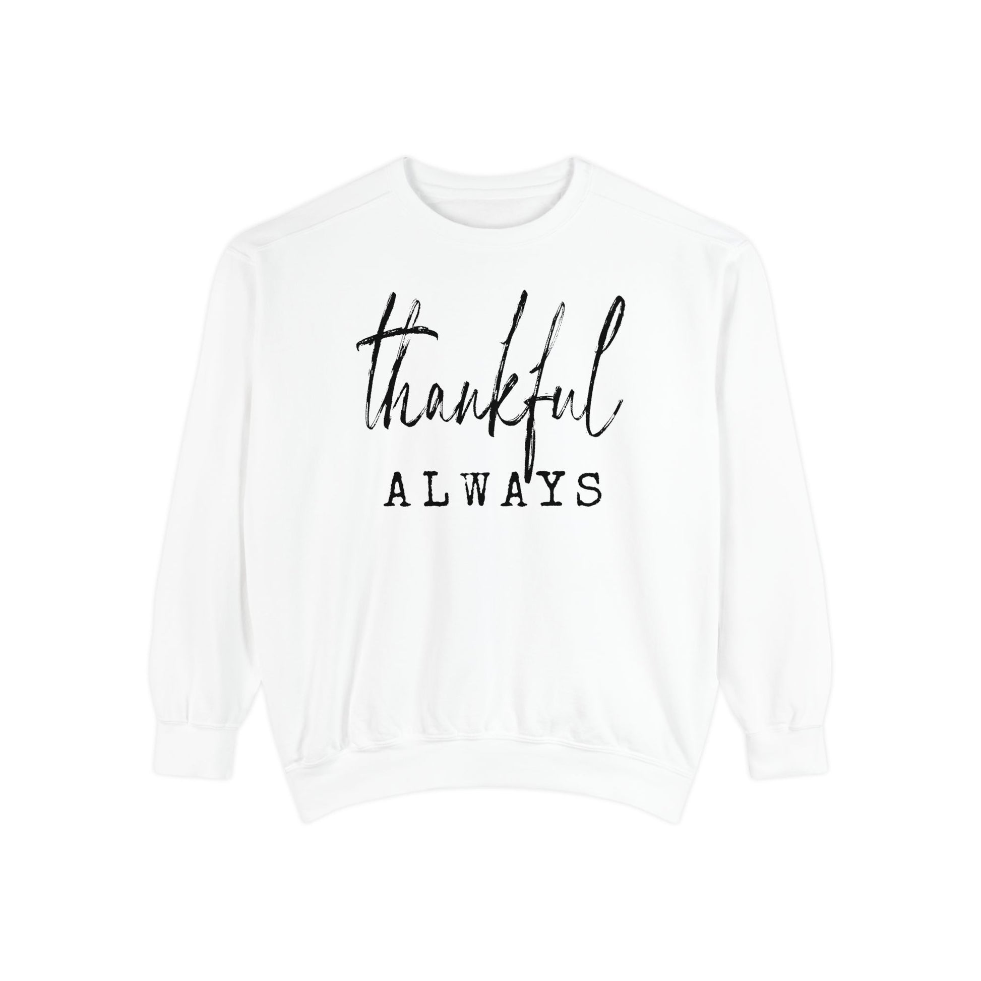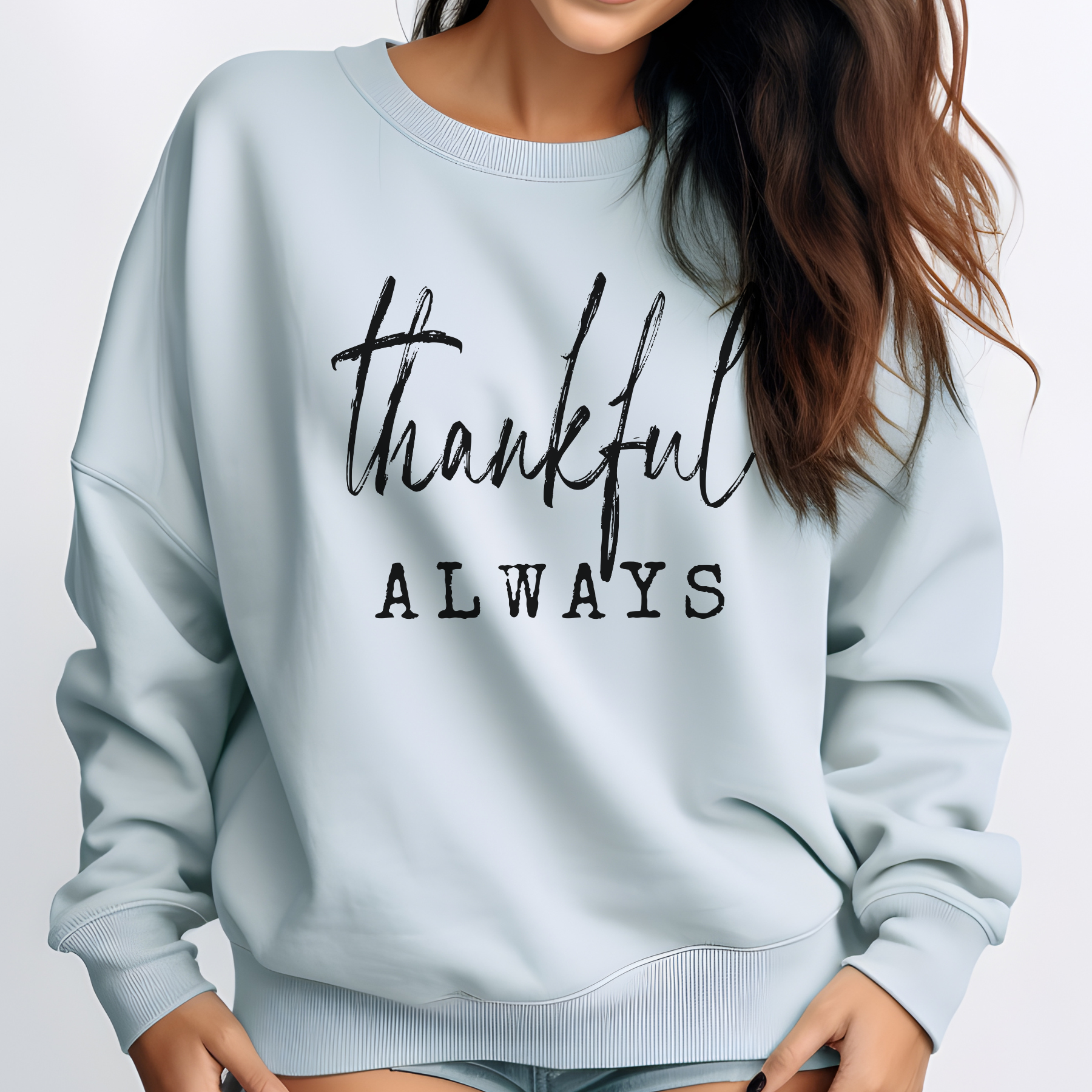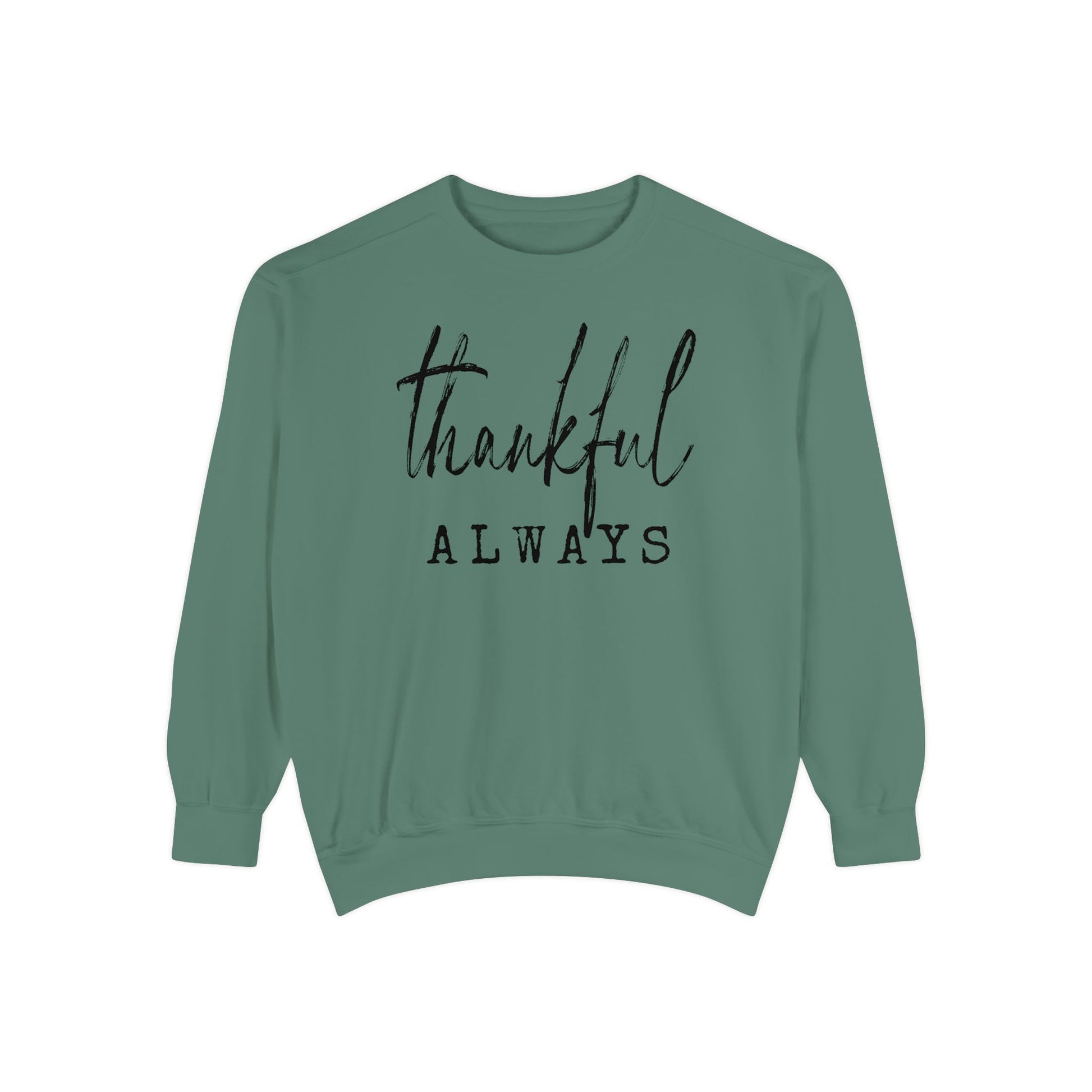 Stay cozy and grateful in this soft and stylish Comfort Colors 1566 crewneck sweatshirt featuring the phrase “thankful always”. With its relaxed fit, vintage-washed look, and lived-in comfort, this sweatshirt is perfect for autumn days, Thanksgiving gatherings, or anytime you want to share a little gratitude.
