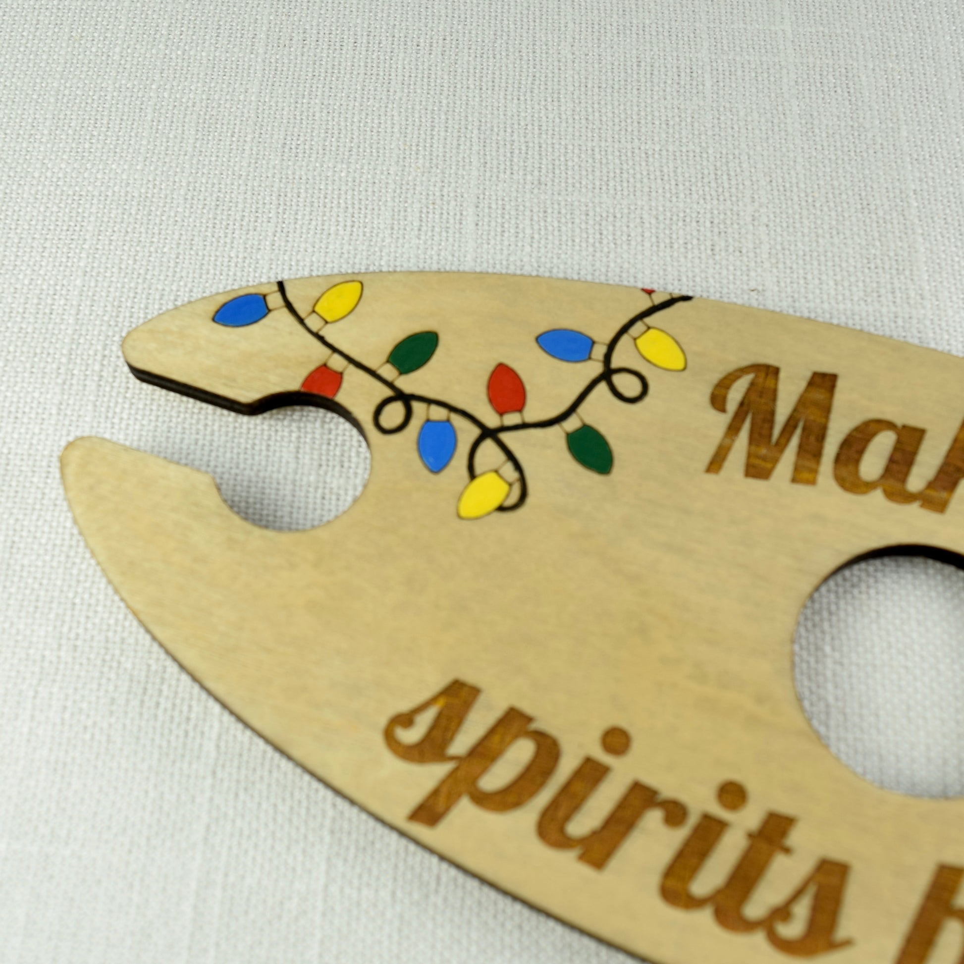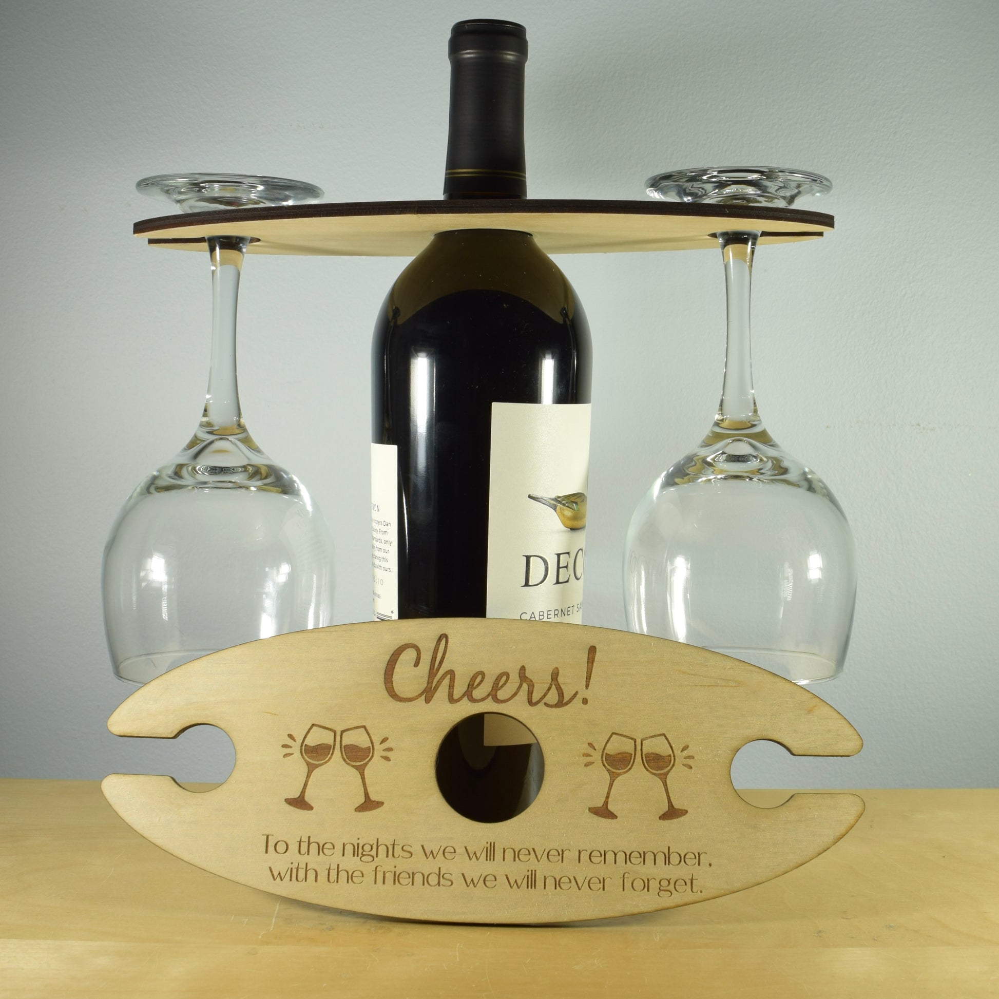 Elevate your holiday entertaining with this beautifully crafted wooden wine caddy! Laser engraved and cut from quality wood, each caddy is carefully prepared and finished by hand, creating a charming and functional display piece. Designed to sit securely on most wine bottles, it can hold two wine glasses, making it perfect for sharing a special bottle with friends or family. Ideal for your holiday table or as a thoughtful gift for wine lovers, this wine caddy adds a touch of elegance to any gathering.